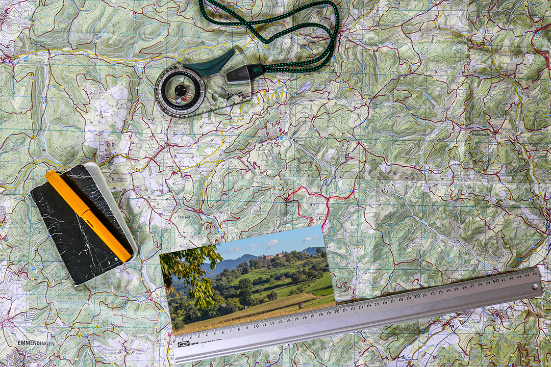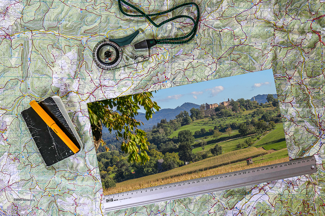 Dieses Panoramafoto zeigt die Ruine der Hochburg bei Emmendingen vor der Kulisse des Schwarzwaldes. Im Vordergrund sieht man die Obstwiesen und Weiden der Staatsdomäne.