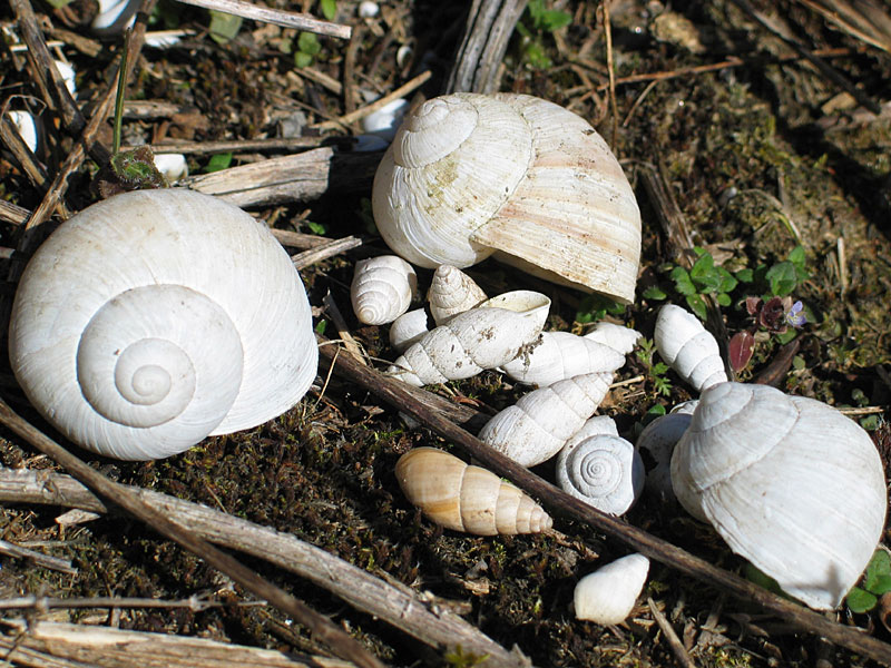 Stilleben am Weinbergshang: Ausgebleichte Schneckengehäuse. Die Raine sind wahre Fundgruben derzeit: Narzissen, Hyazinthen und einiges andere blüht bereits, Eidechsen sind auch schon unterwegs. Witzigerweise ist das lange Zeit verbotene Flämmen der Böschungen wieder erlaubt, nachdem man den Wert für die Natur erkannt hat. Nun müssen all die Kaiserstühler Winzer einen Kurs machen um dann wieder da zu tun, was sie schon Generationen vorher gemacht haben: Böschungen abflämmen.