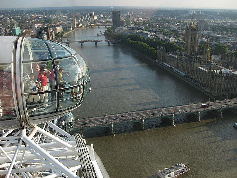 Fast etwas surreal, dass ausgerechnet die auf Traditionen fixierten Engländer an prominentester Stelle von London dieses Riesenrad aufgestellt haben. Anererseits auch wieder typisch: Die Idee ist so gut, dass man das einfach machen muss. Die Fahrt mit dem London Eye ist relativ teuer und dauert etwa eine halbe Stunde. Wenn dazu das Wetter so gut ist, wie es bei uns war, dann kann man mit dem Geld fast nix Besseres anfangen.